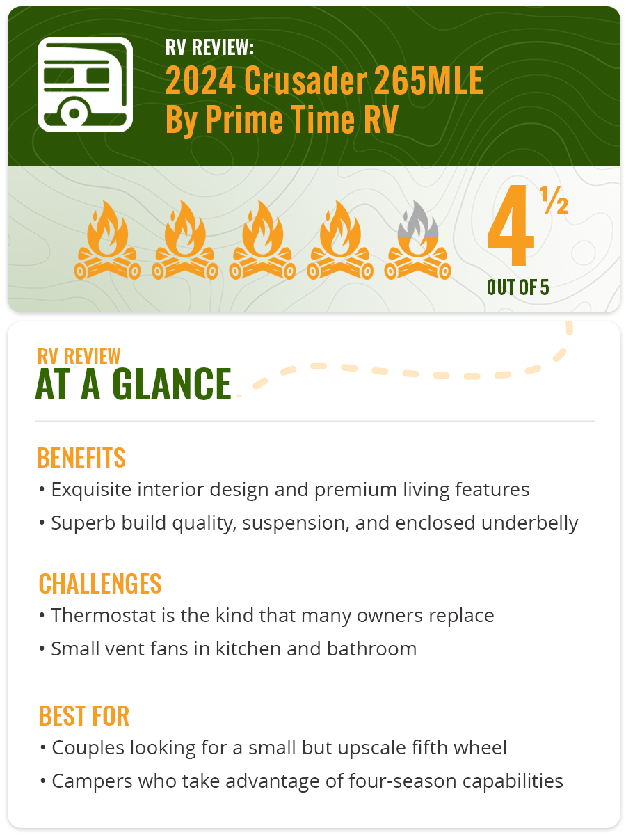 I gave the Prime Time RV Crusader 265MLE four and half out of five stars. This RV is well thought out with several solid features that will play-out well over time. The overall feel of this RV and little details are going to continue to be appreciated. The reason it didn’t receive a higher rating is that a few small details, like the thermostat and vent fans, don’t fit into the otherwise premium feel of this rig.