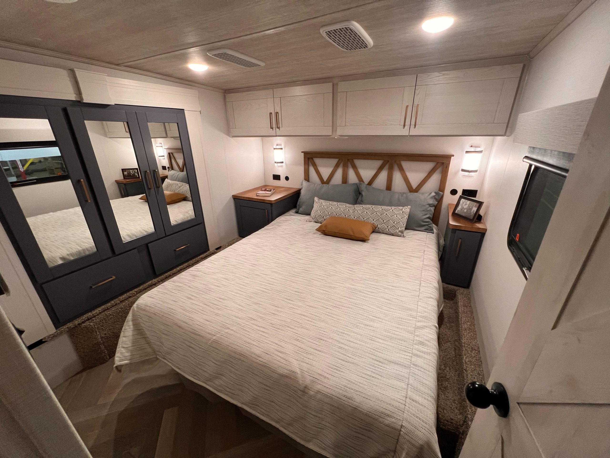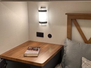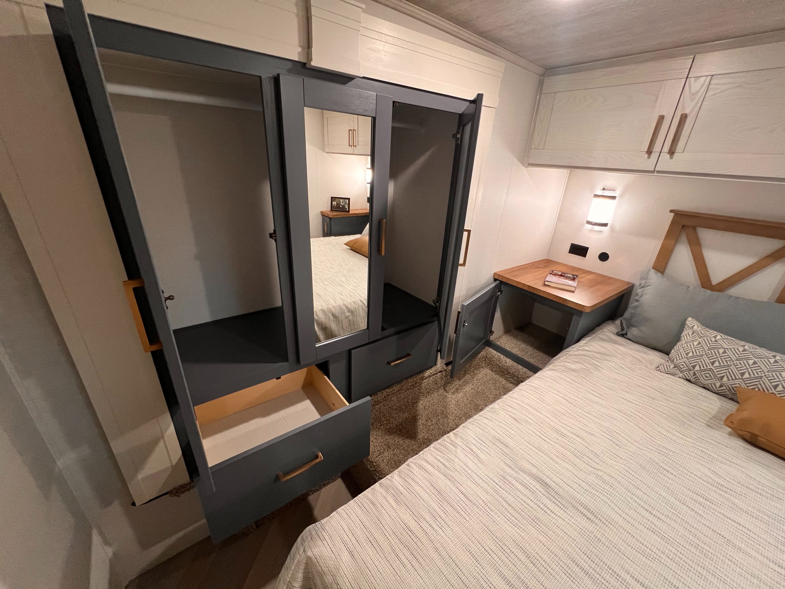 Upstairs, the bedroom features a queen-size bed. The bed itself is offset toward the camp side, which gives the opportunity to have a larger cabinet on the road side. That also provides space to accommodate a rather deep wardrobe slide with both hanging storage and drawers. (A rare RV luxury.) Conveniently, there are both household and USB outlets on each side of the bed.