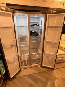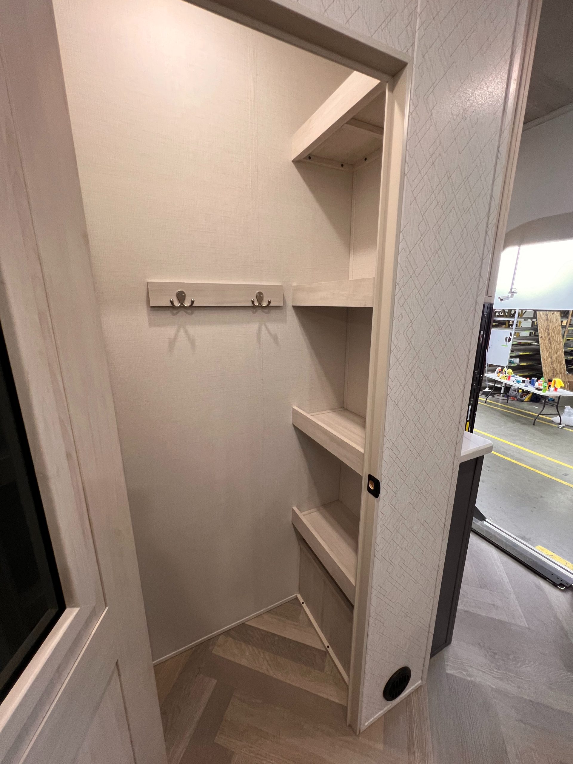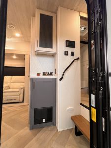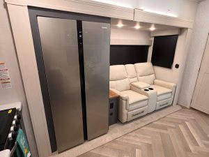 There’s also a walk-in pantry with enough space that it has a shelf with a power outlet. Naturally, this could be used for a coffee maker or blender. (Or, even better, a Margaritaville frozen concoction maker.) There’s also hanging storage and additional shelves here, too. For all those storing brooms or vacuums in their RV, this rig actually has a spot for those, as well as hanging space for coats and such. Another nice feature is the larger 16-cubic-foot, 12-volt fridge, very similar in size to the unit in many people’s homes.