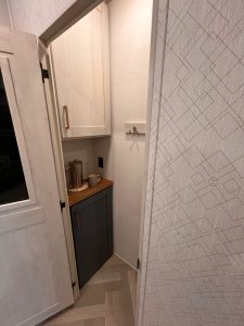 As you enter the cabin there’s a neat smaller cabinet right opposite the doorway. (Could be a great place for a key rack, for example.) There’s also space under the steps for shoes.
