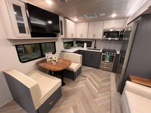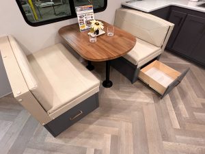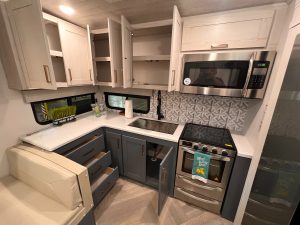 The back wall of this rig has the kitchen counter across the width of the unit with a three-burner propane stove. It also features a large, usable oven. There are plenty of cabinets and drawers in here so storage shouldn’t be an issue. Even so, there is additional storage under the dinette.