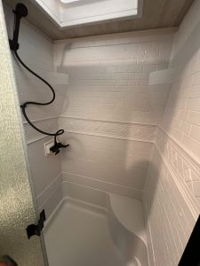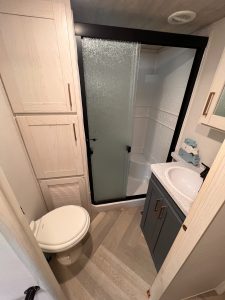 Through the upstairs, there is also good attention to detail. And that continues with the large bathroom, which even features a 40-inch shower. A ceramic toilet is another plus. It also has something you don’t often see in RVs: actual bathroom cabinets with doors. Many RV companies are shifting to simply using cubbies in bathroom cabinets, which seems odd in a moving vehicle. Not so — thankfully — in this bathroom.