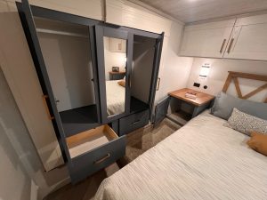 On the main floor, there’s that large pantry that sports two storage cabinets and a shelf with an adjacent power outlet. There’s a lot of space in cabinets and drawers around the kitchen and under the dinette as well. While bathroom storage seems to be disappearing in a lot of RVs, it’s plentiful here with stacked cabinets as well as a bit of storage under the sink. The main bedroom has a wardrobe slide with two big drawers and plenty of hanging storage plus there’s a lot of space over the bed as well as cabinets on either side.