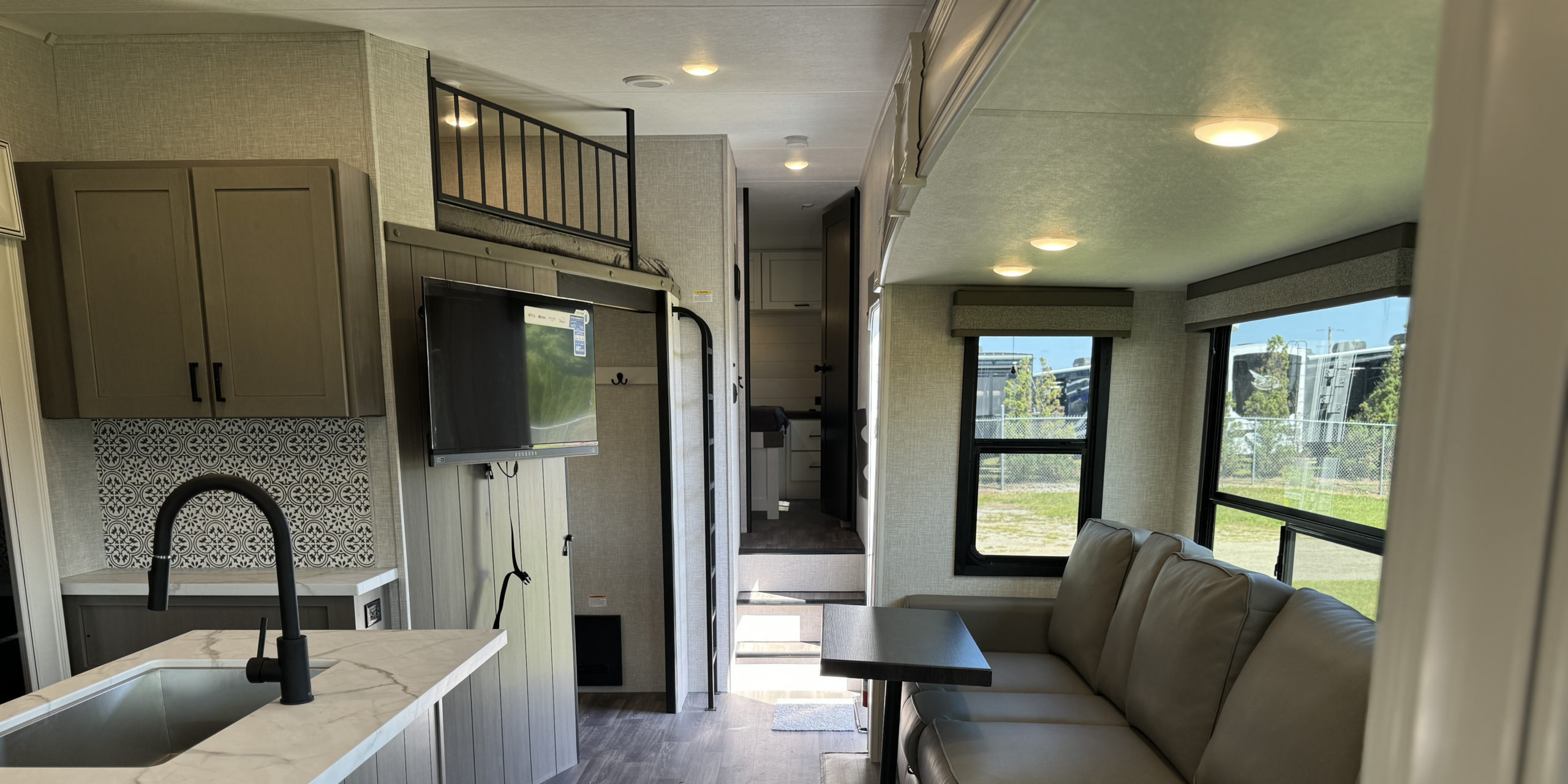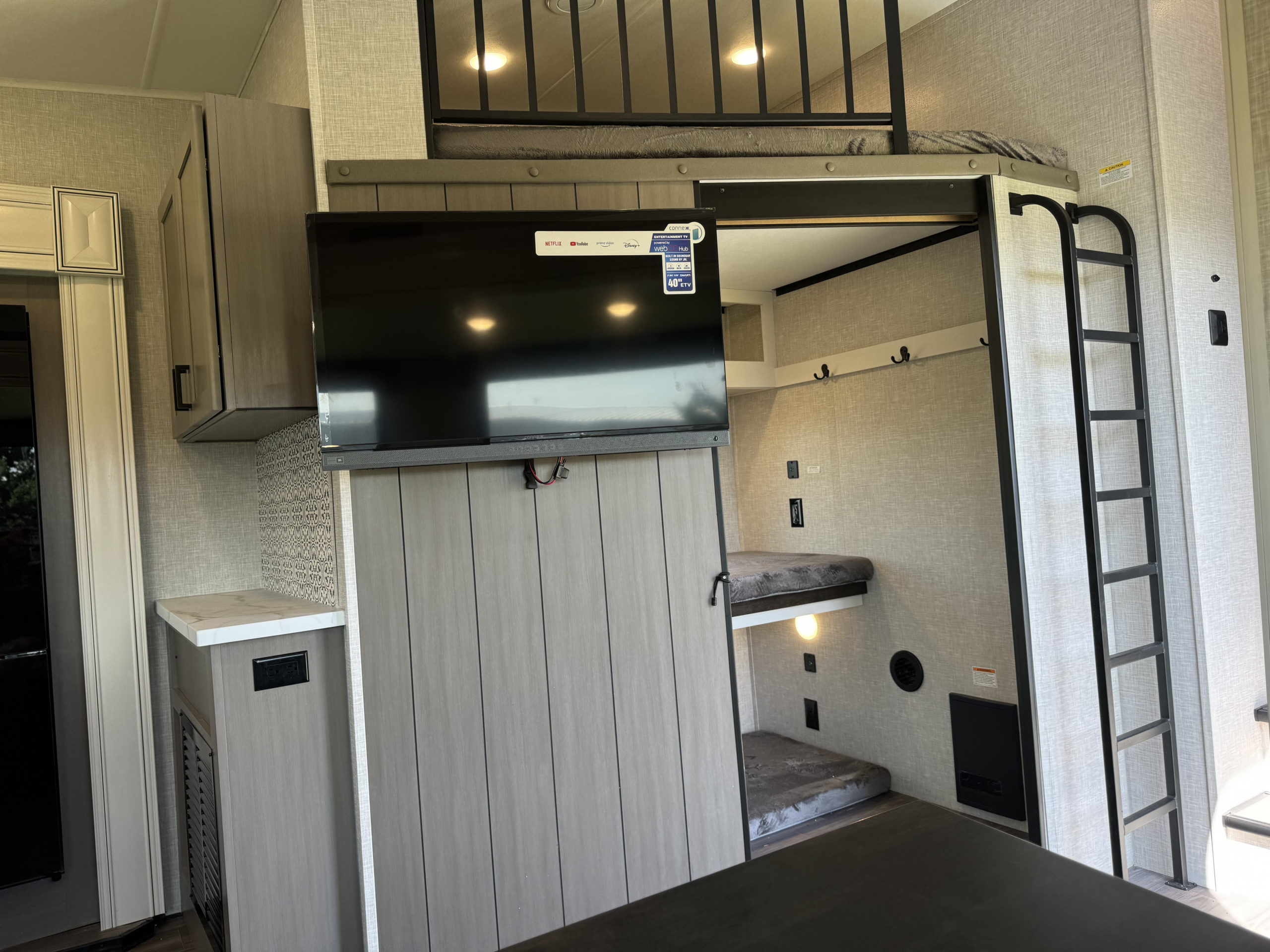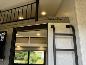 The 2025 Highland Ridge Open Range 390TBS is a model of luxury. It checks the boxes for decadent living spaces and sleeping arrangements. The open floorplan includes a clever loft space with three sleeping areas for kids. With narrow mattresses and a low headspace, this room is definitely intended for children. Kids need only their imagination to make a space their own, headroom is not a requirement. (My kids seem to prefer tiny awkward spaces for their imaginative fort dwellings. )