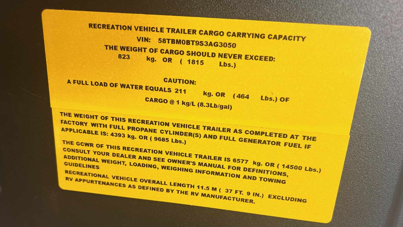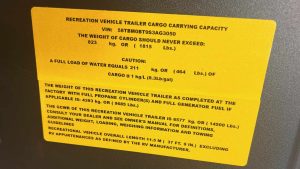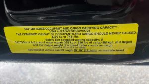 One last area to look at is with data plate on the RV. All new RVs have to have one. This will show you how much cargo the RV can carry. It spells it out fairly clearly. You should know that there should be sufficient cargo carrying capability to reasonably accommodate the things you’d normally bring camping. Some RVs are built so close to capacity that there is little accommodation for your stuff. (This is particularly true in some Class C motorhomes, but not all.)