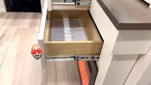 You can also see how far the drawers extend and what type of drawer slide mechanism is used. Nowadays, many RVs use ball-bearing glides, but there is a difference in the weight carrying capacity of these glides. There are also a few that are under the drawer box itself. (So you don’t even see the glide.)
