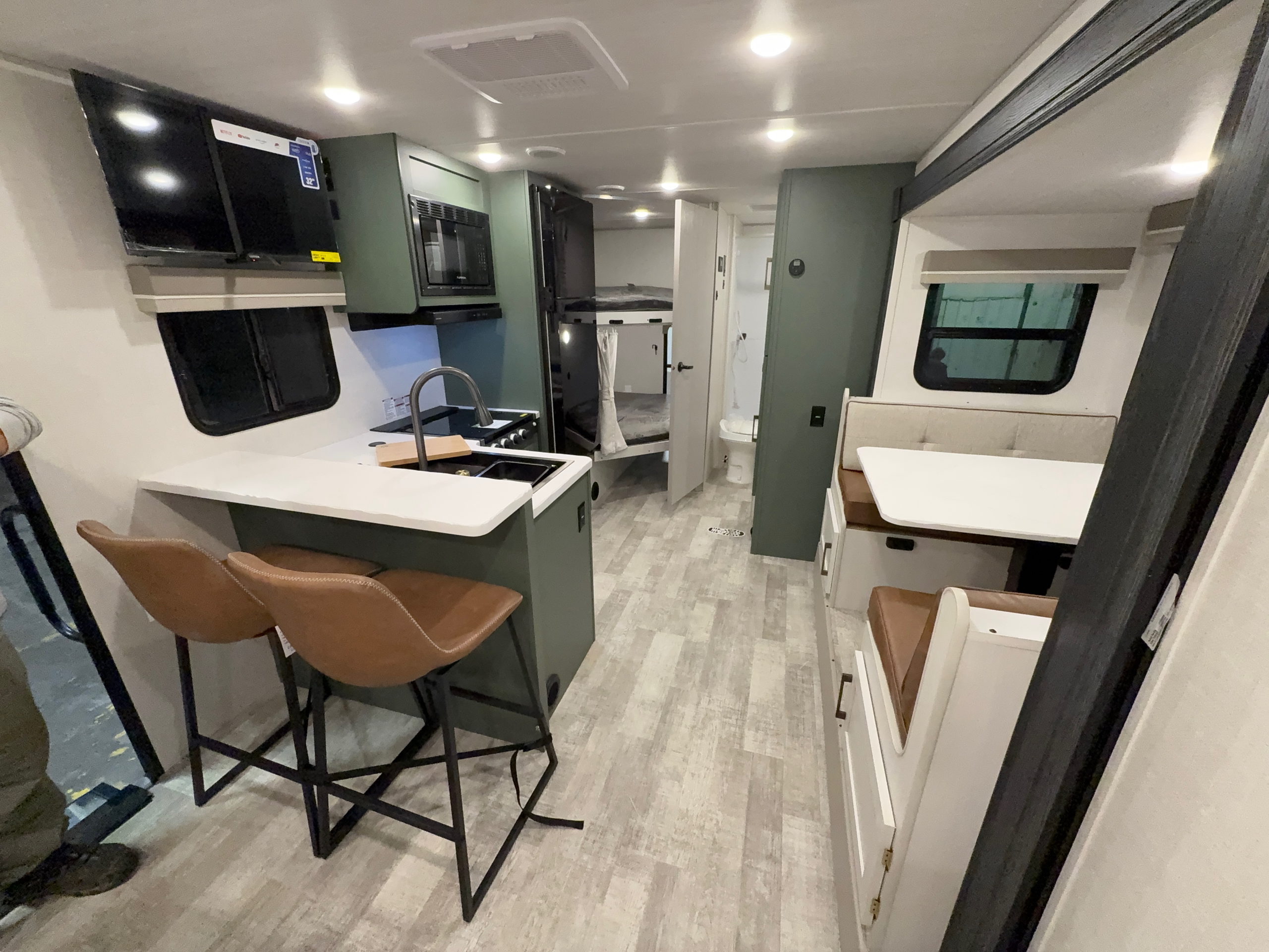 - Sleeps up to 8: You’ll be able to fit a whole family between the queen-size bed in the master suite, the convertible dinette and loungers, and the bunk space.