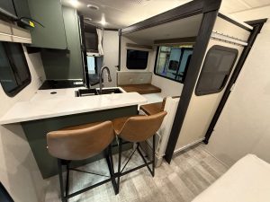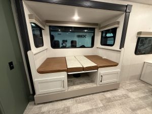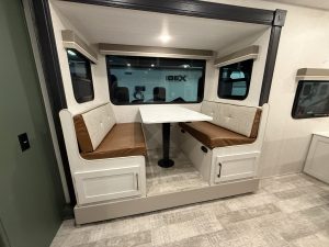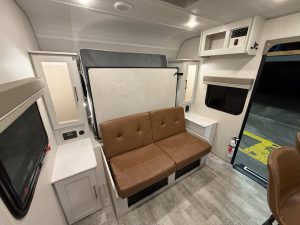 On the passenger side is a convertible dinette. The long side of the dinette is a little awkward to get into, but it does offer a decent amount of seating. There are seat belts on the dinette for additional seating while you’re on the road. One end of the dinette has a built-in drawer for storage, while the other features a clever pull-out bench for additional seating when parked.
