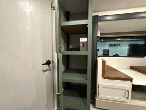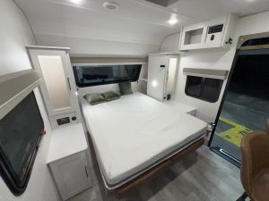 The master suite in this unit checks almost all the boxes. A residential queen mattress is a nice touch in this Class C. Tall travelers won’t have to worry about their toes dangling off the edge.