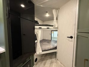 The over the cab bunk is an inviting little nook. It is begging for a pillow fort with blankets and flashlights. The space is equipped with all the creature comforts a visitor needs. There is a TV, two hidden storage compartments, and drink holders. I appreciate the safety netting feature here to keep kids, or vivid dreamers, from rolling out of the top bunk.