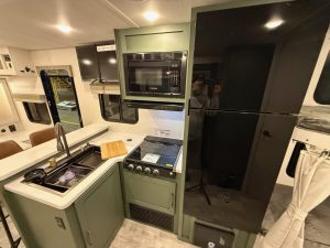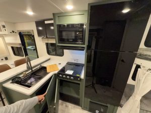 I am impressed at how much kitchen they crammed into a small corner of this rig. It opens up the interior space, but the feng shui of the kitchen took a slight hit. The stove is in the corner of the room, which feels a bit boxed-in. For some, cooking in the kitchen requires a little more breathing room. But for those that just want to get the job done, this could be perfect.