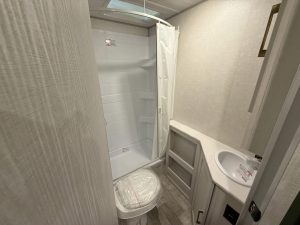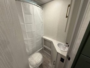 The bathroom on the Leprechaun 260DS is inside the master suite, with no other access door, which can create a privacy issue if your guests need to use the toilet overnight. That said, the bathroom is just right in this unit, with nothing extra: a porcelain foot flush toilet in the corner, between a large cabinet space with three shelves and a sink, with the shower on the end.