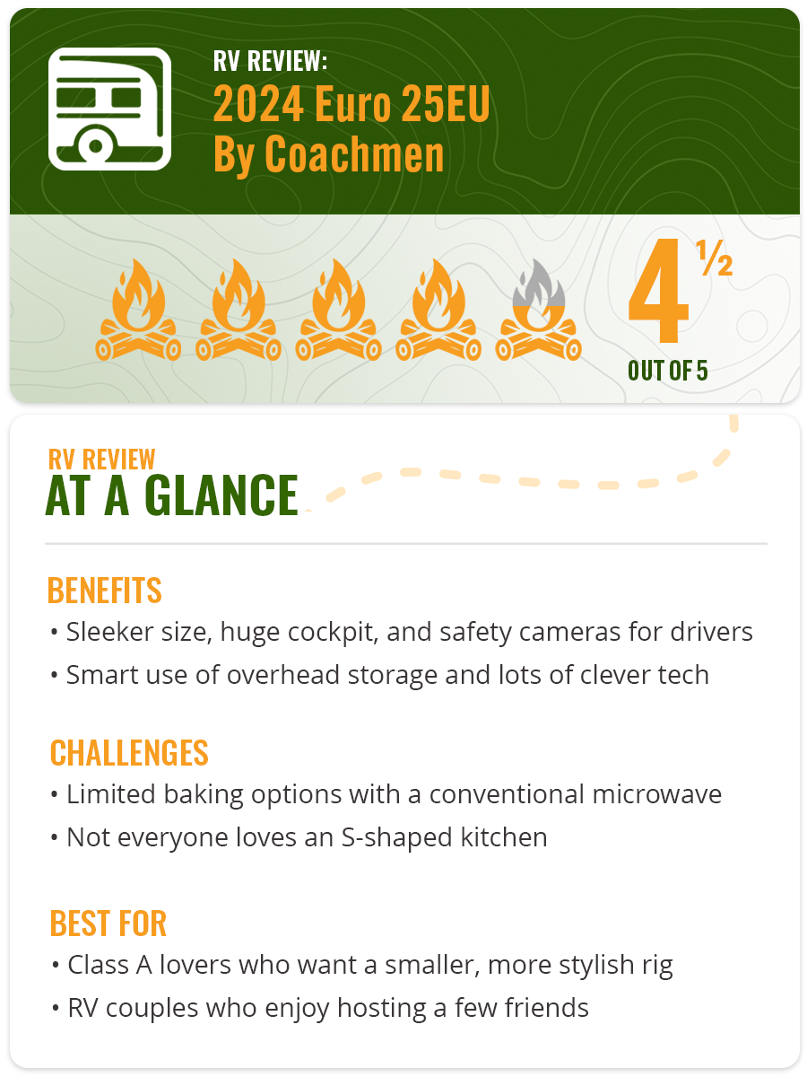 There are a lot of Class A gasoline-powered motorhomes out there — and the 2025 motorhomes don’t change that direction. But something I like about the Jayco Asante 29S is the company’s J-Ride package. All the current Class A gassers are based on a Ford chassis that, let’s face it, was originally designed for commercial duty. Jayco takes a number of steps to improve ride but also handling and control. This can make a big difference in how relaxed your are when you get to camp. It’s well worth test driving these gas-powered Class A motorhomes before you make a final buying decision.