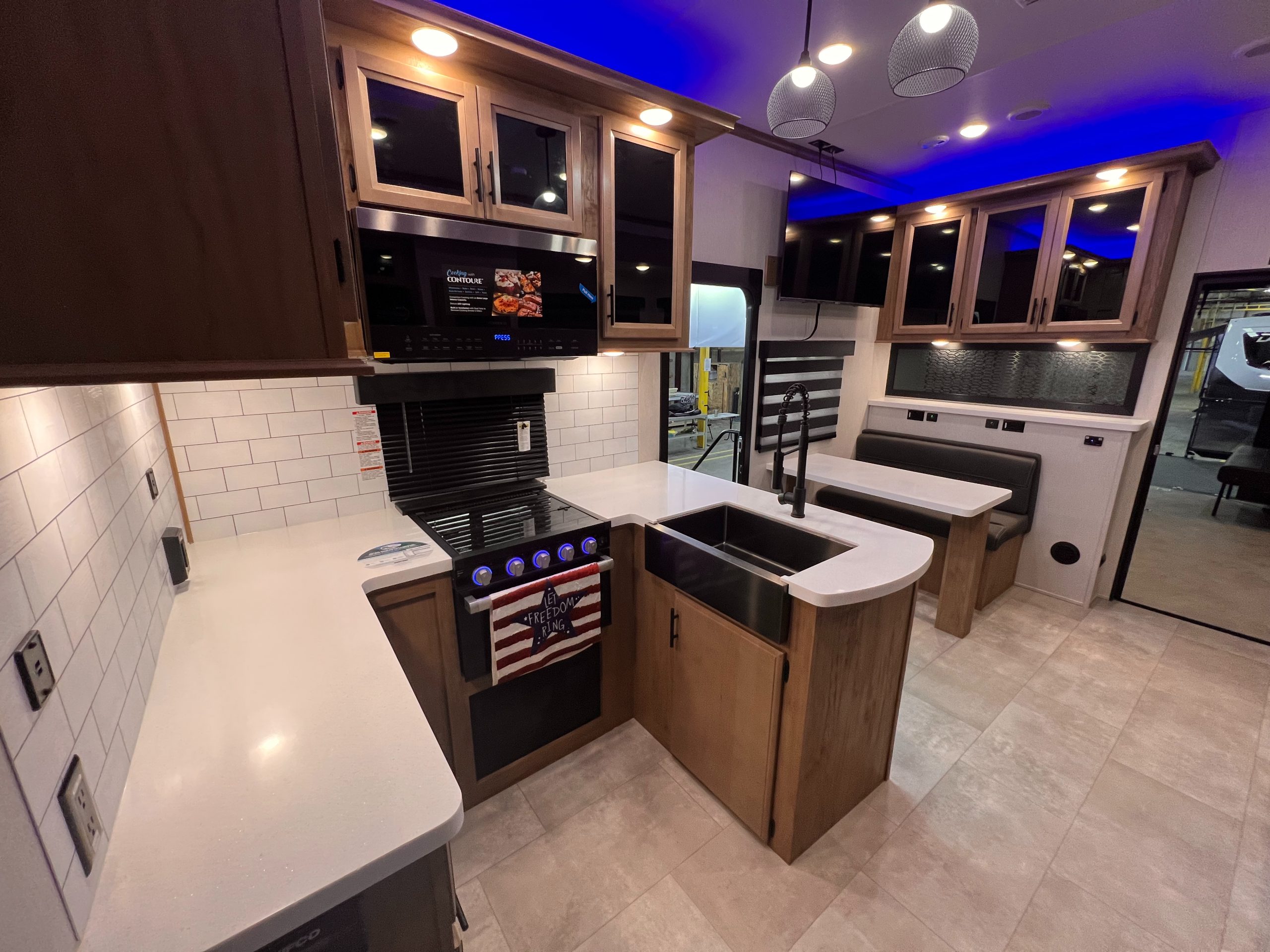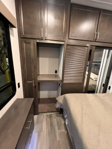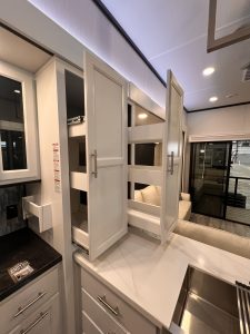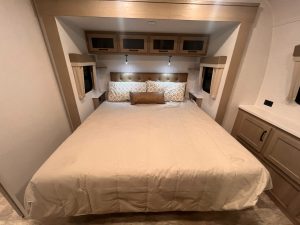 But it also has bunks on that can accommodate two full-sized adults or you can flip the bunk up and now have a huge closet with lots of hanging storage. There’s also an over-cab bunk in a raised cap. Two adults can easily sleep up there and they can also sit up what with the headroom provided by that raised cap. On the front of the cap is a large windshield that curves up which has a power-operated shade. You could enjoy the stars but that shade can also provide complete black-out of outside lights. There’s also a proper 72-inch by 80-inch bed in the back that features a tilt-up mechanism so you could sit and read reviews here on RVTrader until late.