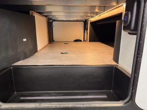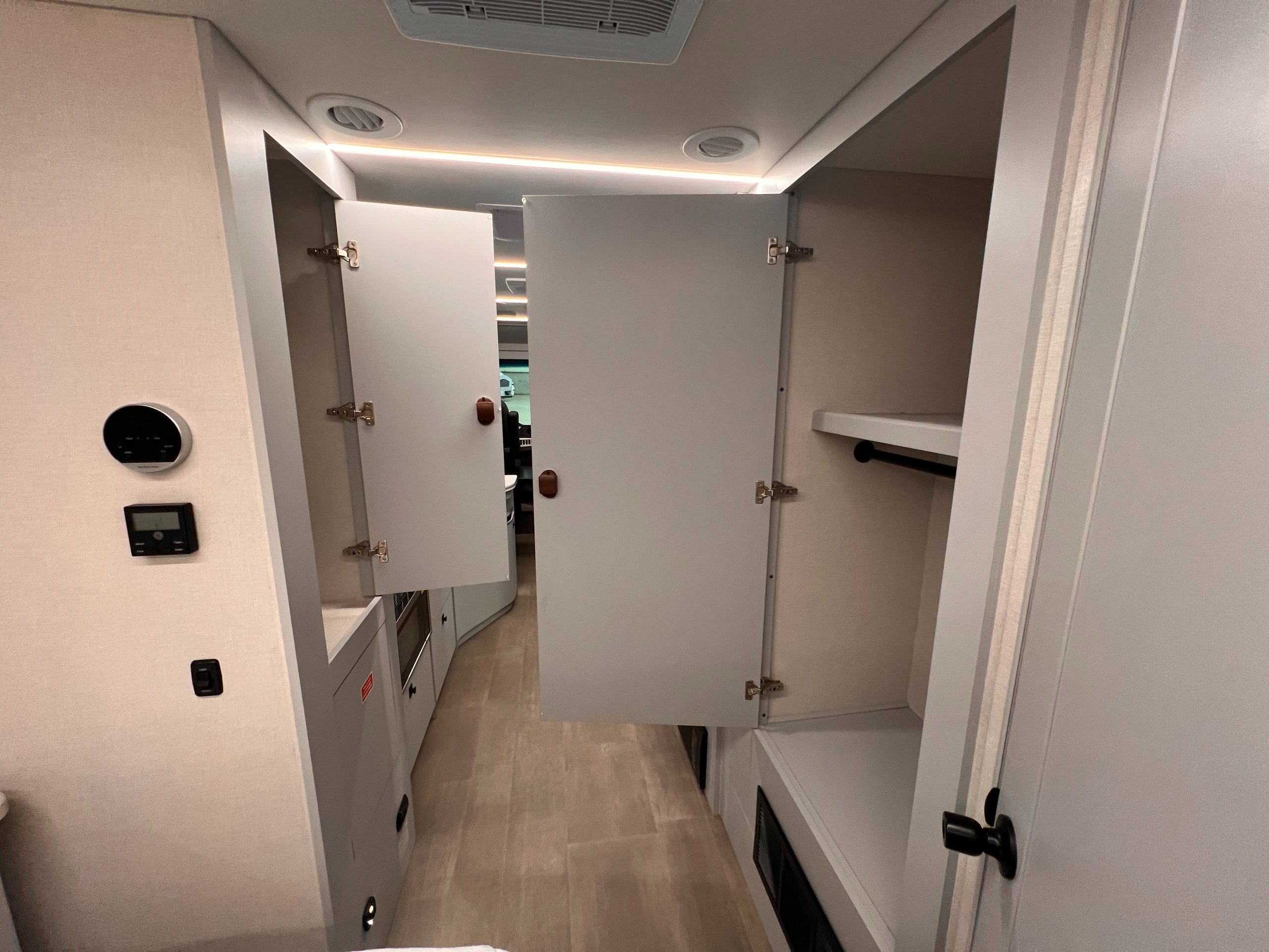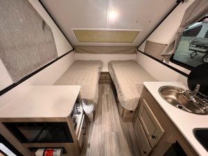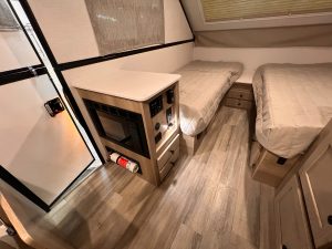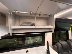 The floorplan of this features twin beds at the back. That makes room for lots of storage in a compartment below. (Much like the Winnebago EKKO’s floorplan.)