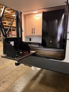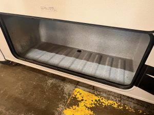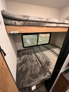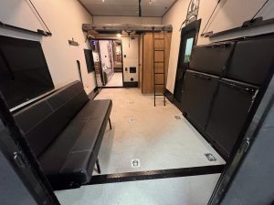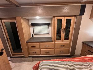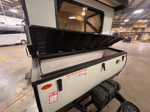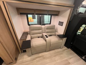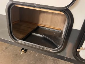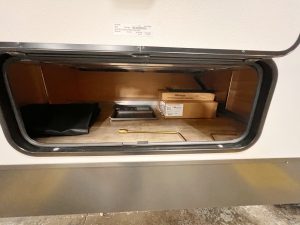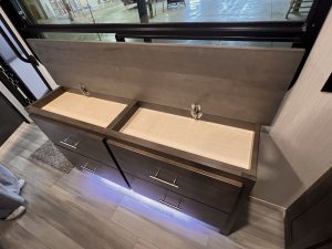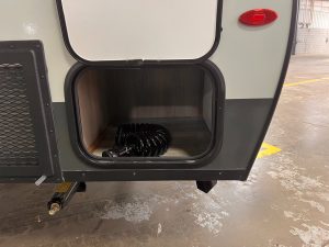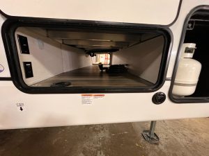 Not to be outdone, we just got a sneak peek at the new-for-2025 Thor Gemini Trip 22MT. This is a very unique Class C that features a very large cargo bay at the back. There are storage cubbies on the road side of this space as well as two very large drawers and cargo tie-downs make it especially useful. This is easily big enough to swallow a couple of e-Bikes. There is a large compartment door on the camp side as well as another at the very back to make loading and unloading your gear a simple task.