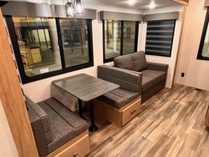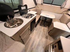 The layout features a large U-shaped dinette at the back. The kitchen is on the camp side. And the bathroom on the road side. The dinette can also double as your main sleeping space. But there’s also a larger over-cab bunk that you could leave permanently set up for a restful night.