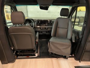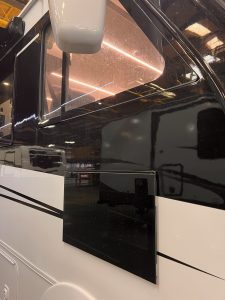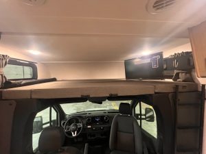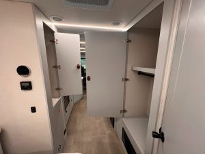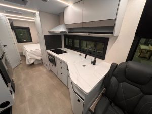 The model we saw had 960 amp hours of lithium battery power that could use an installed second alternator on the Mercedes-Benz Sprinter that works to recharge these batteries. There is also a minimal 220 watt solar panel on the roof.