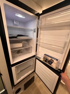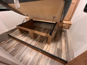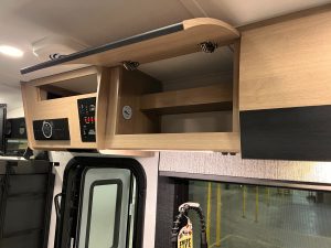 The secret to this floorplan lies in a power-operated bed measuring 60-inch by 74-inch over the cargo bay. Simply push a button at night, and you’ve got a proper bed. The bed can also be lowered to a height that suits you. So, you could accommodate some cargo back here or go all the way down.