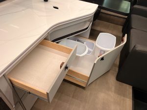 The Winnebago EKKO has now been on the market for a few years and started the trend in the U.S. of rather boxy Class B+ vans with plentiful storage and a European-inspired interior. Something that really is unusual in the Winnebago EKKO is the bathroom. It can be optimized to provide more shower space or more space for other bathroom-related function. But the big thing in the EKKO has been the cargo bay at the back, which is located under the twin beds. This cargo area is large enough to hold things like bicycles or other cargo that other Class B+ and C RVs just didn’t have the space for.
