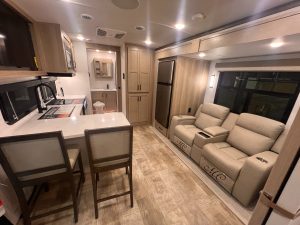 This is the smallest of the Class C motorhomes in this article. It measures just over 20 feet in length. This no-slide Class C could be a really great choice for someone looking for a simple and affordable Class C. You know, one that doesn’t feel cramped. Considering it had no slide, I was really surprised at how open it felt.