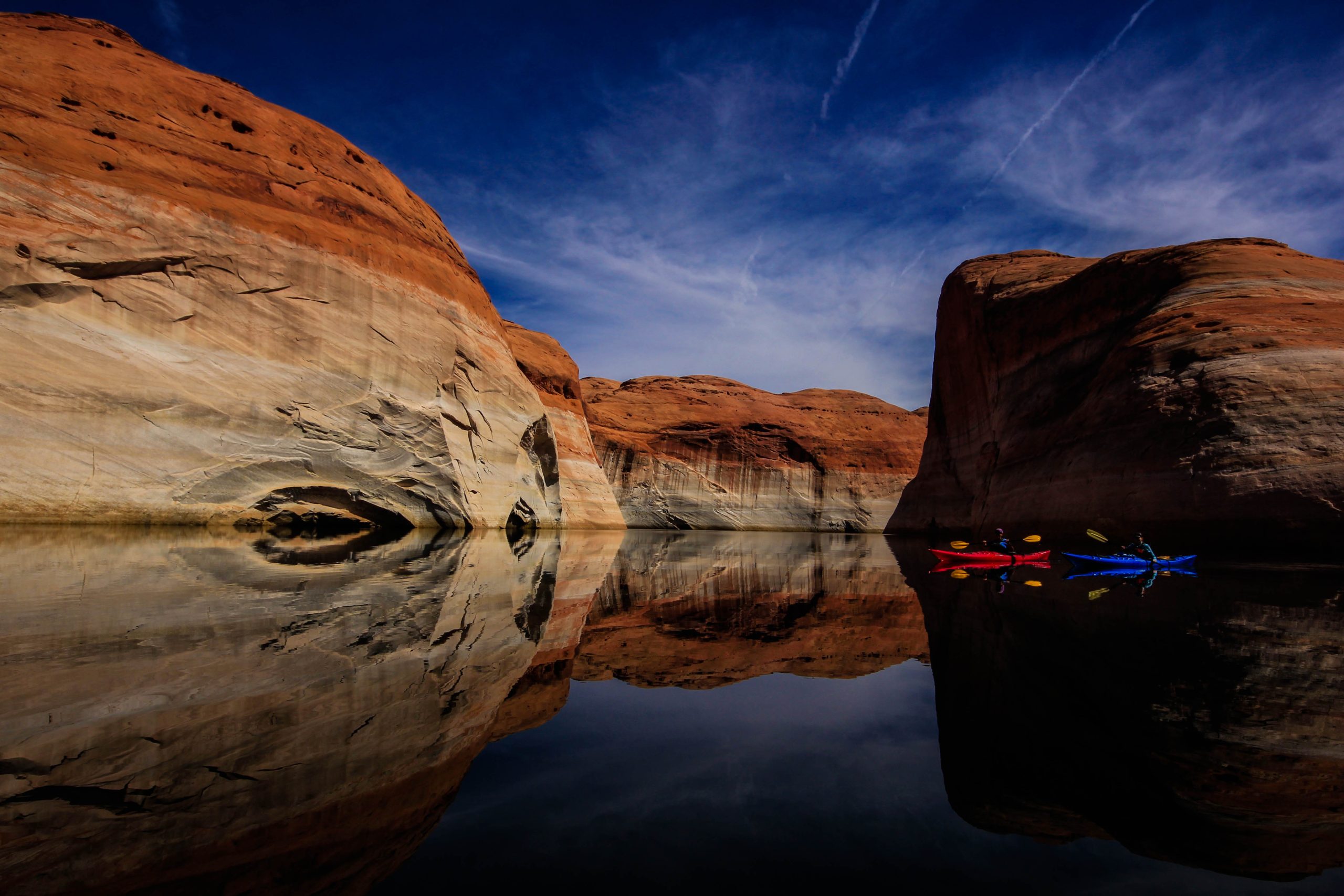Lake Powell, Utah. Exploring the narrow side canyons away from the main lake provides a more serene experience as you’ll be away from most of the motorboat traffic.  It also affords you the opportunity to explore Ancient Puebloan ruins and sandstone cathedrals.