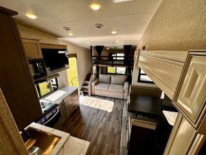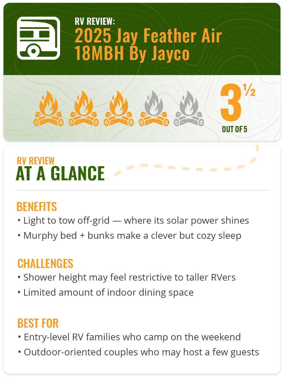 The 2025 Jayco Jay Feather Air 18MBH is a well-appointed yet lightweight travel trailer that’s perfect for making off-grid family memories with the kids. This innovative travel trailer is a part of Jayco’s extensive Jay Feather Air line, and this model is available in four unique floor plans, but I was thrilled to be able to check out the family-oriented floorplan: the 18BH. This layout has a lot to offer in a compact package. With two double bunks at the rear and a queen Murphy bed over the sofa at the front, there’s plenty of sleeping room in this very space efficient RV.