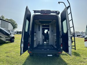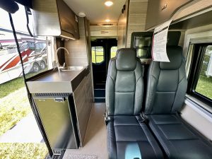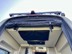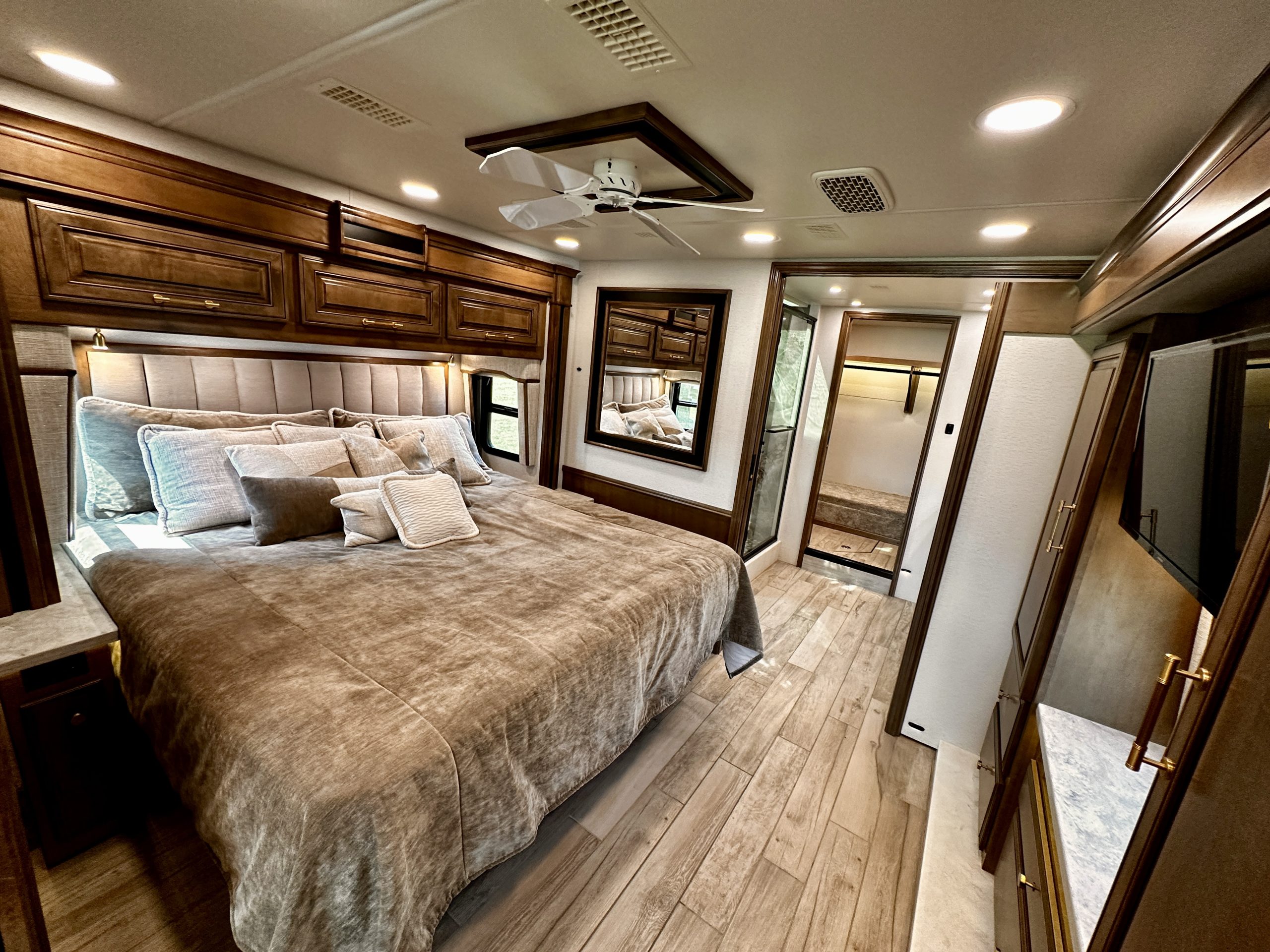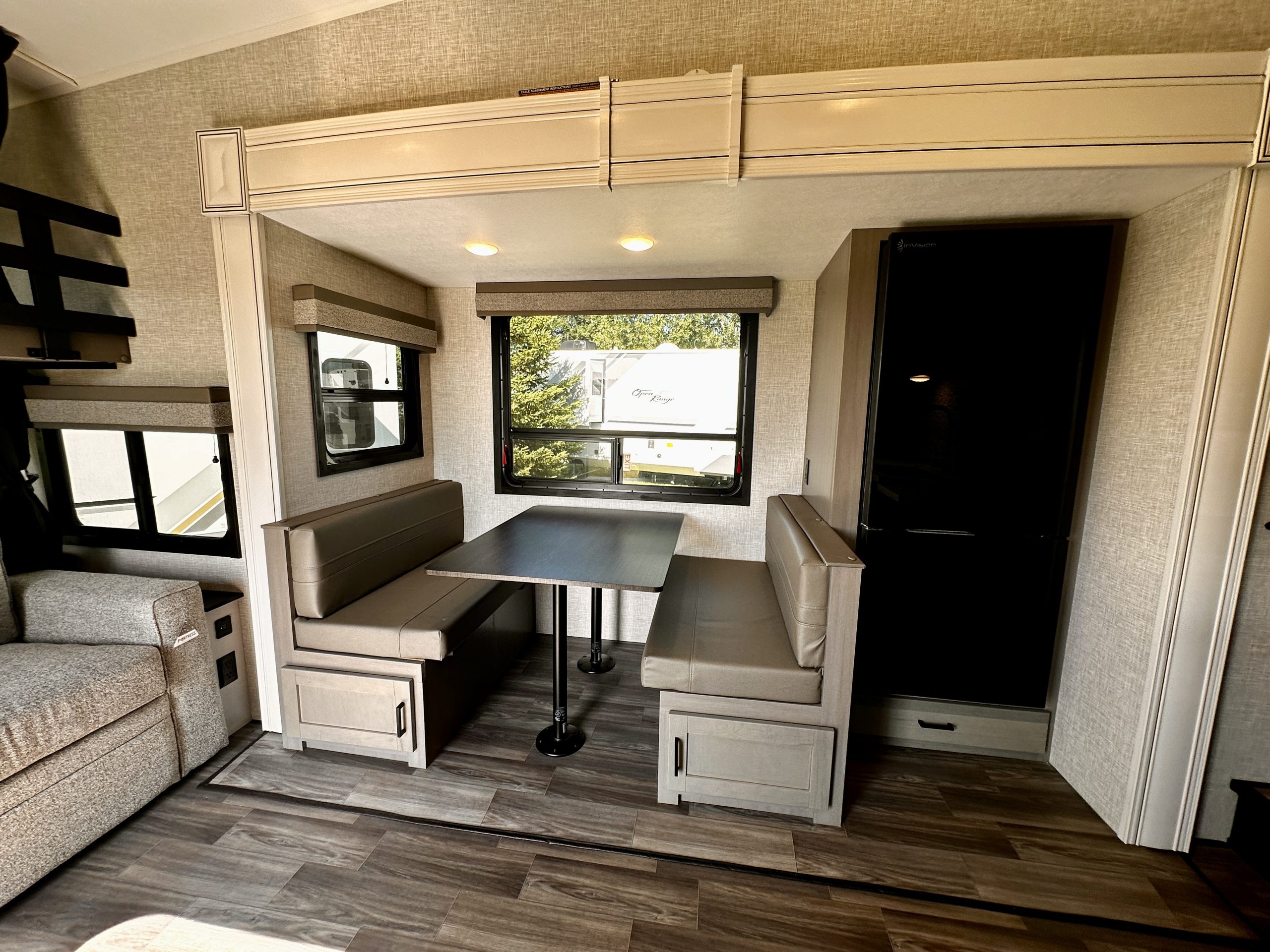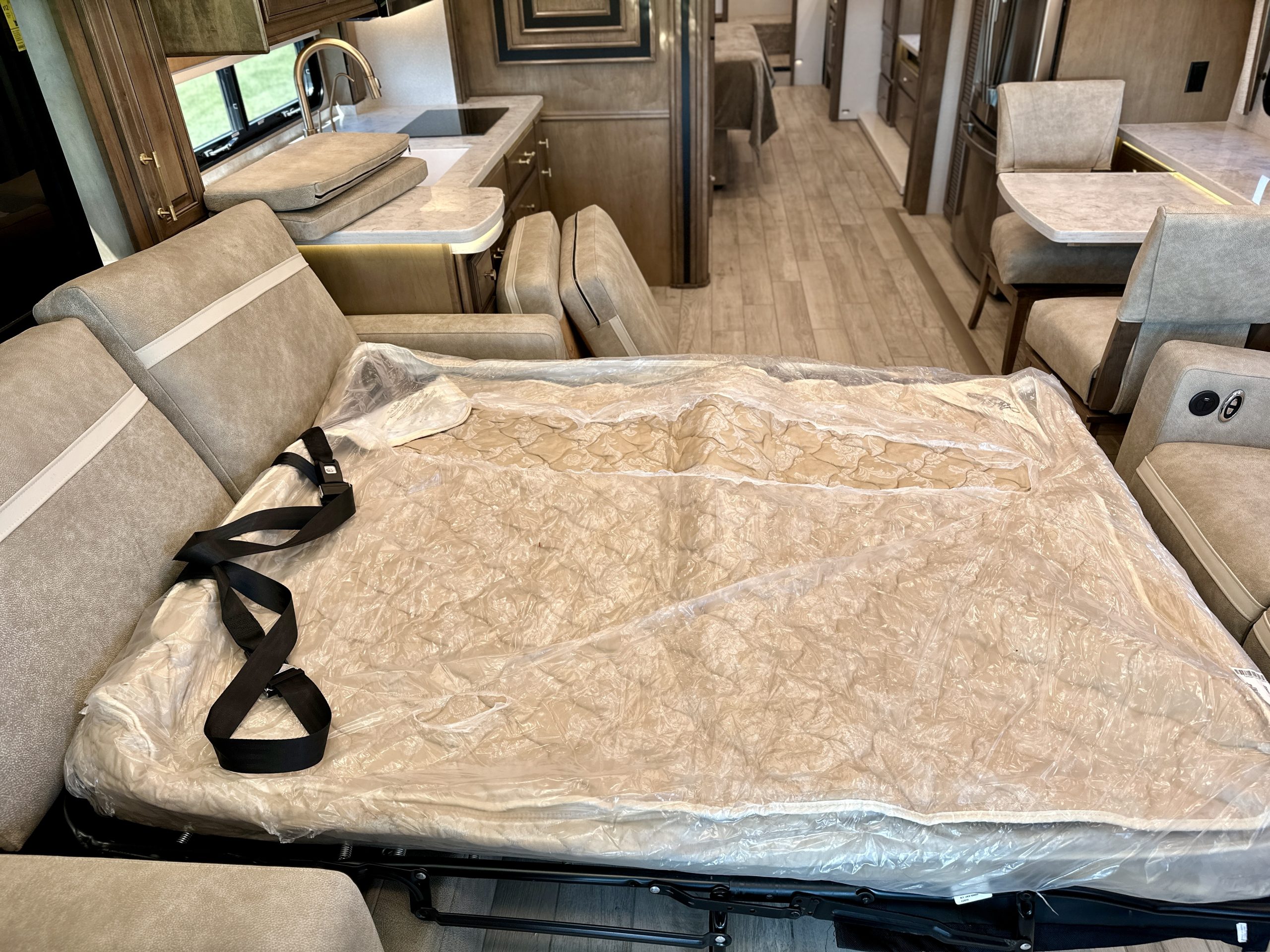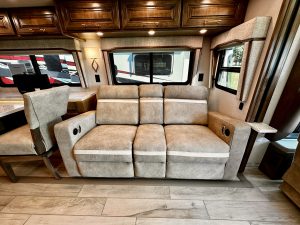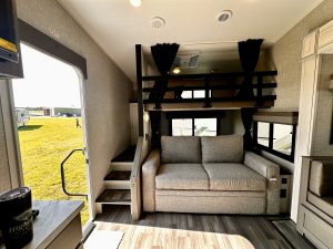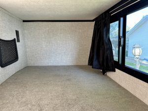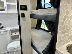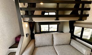 Each of the two spacious bunks tucked away in the back of this RV can hold up to 600 pounds. In addition, each bunk gets its own window. Plus, USB ports. Plus, a power outlet. And also a wall-mounted bag for storing necessities. Four-inch-thick, soft-touch mattresses ensure that whichever campers sleep there are comfy and cozy.