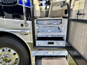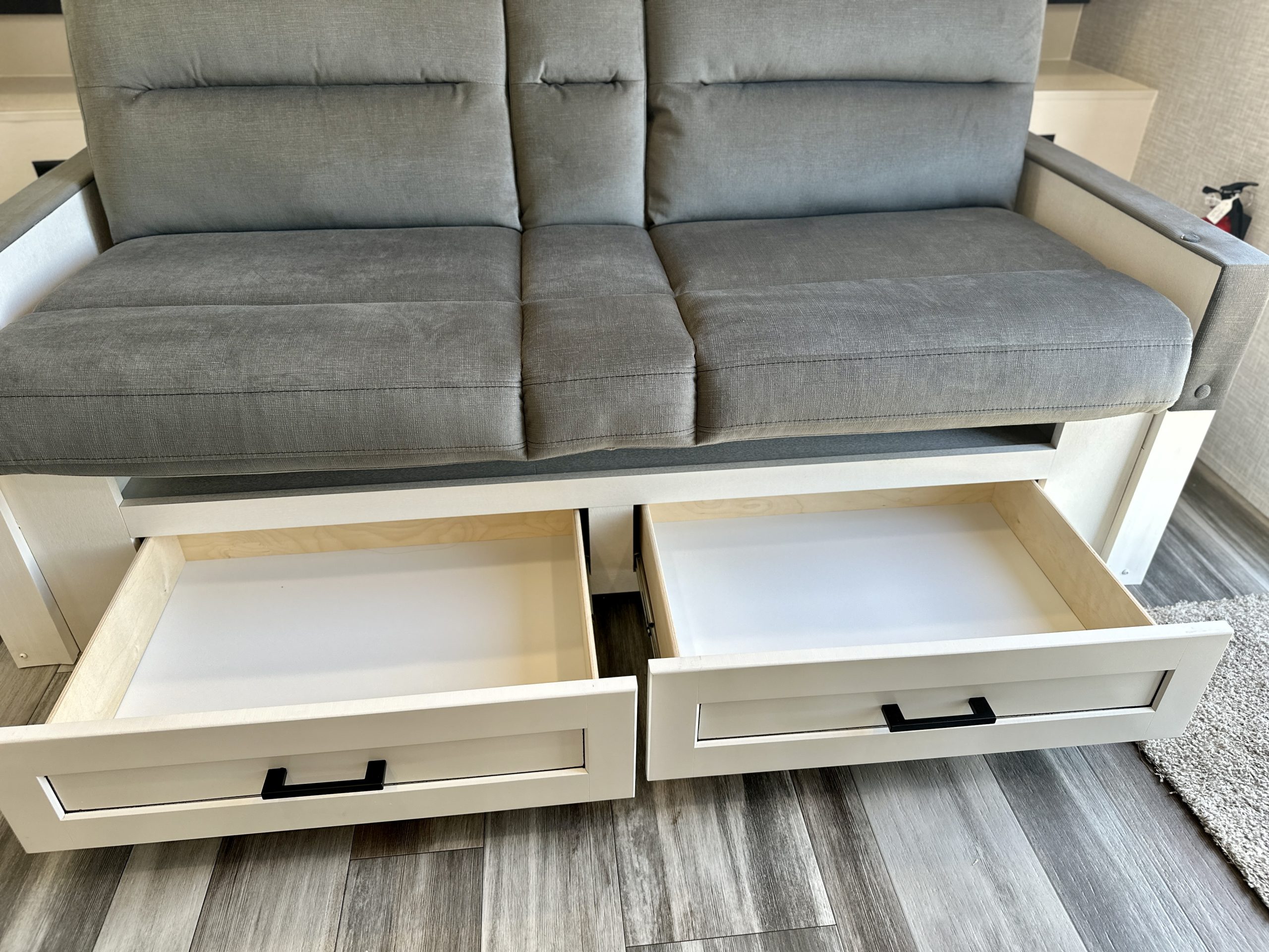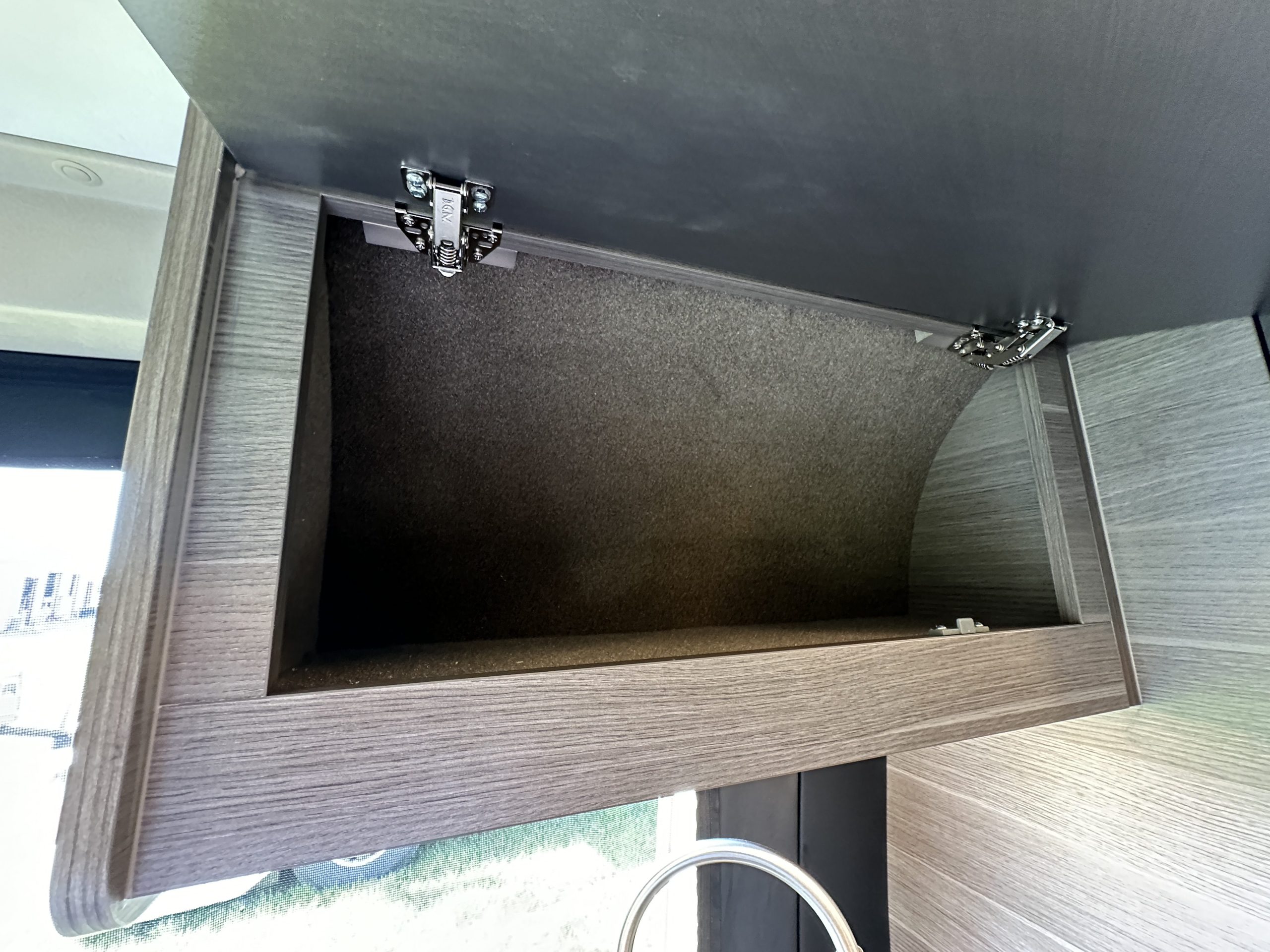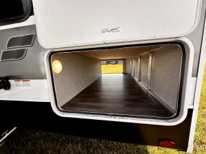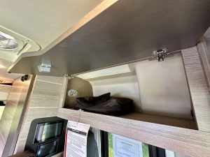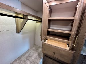 Understandably, storage space can be lean at best in many small RVs. Jayco has done a great job of maximizing storage throughout this Jay Feather Air 18MBH. Outside, there’s a passthrough basement, plus a smaller cabinet at the rear of the RV. Inside, there is a plethora of storage options in cabinets and drawers. The front bedroom area has two wardrobes that have removable shelves. So, you can set them up to suit your own needs. In addition the nightstands on either side of the Murphy bed, each have a drawer for storing smaller items.