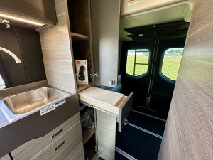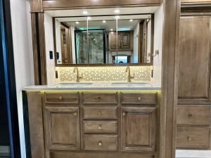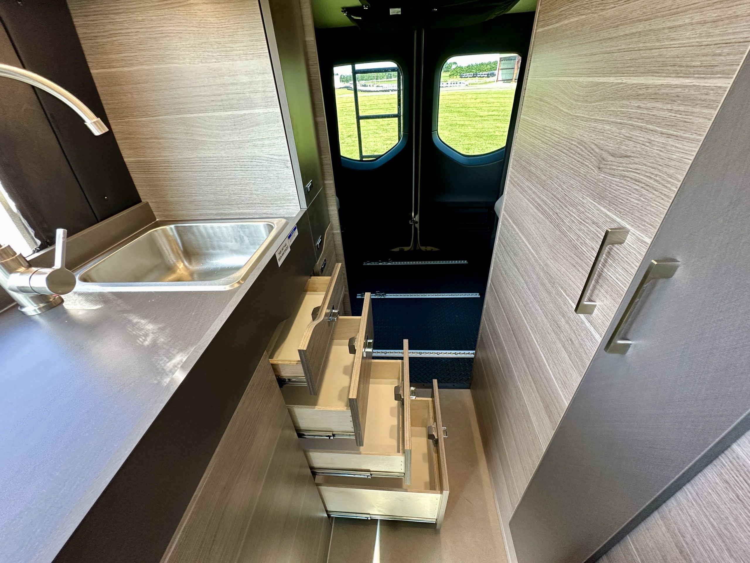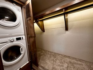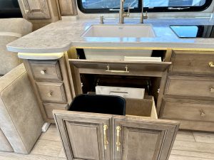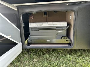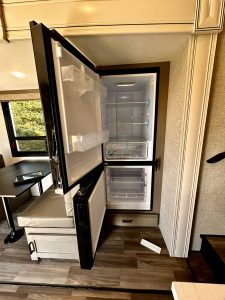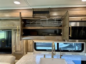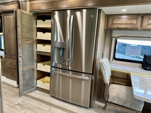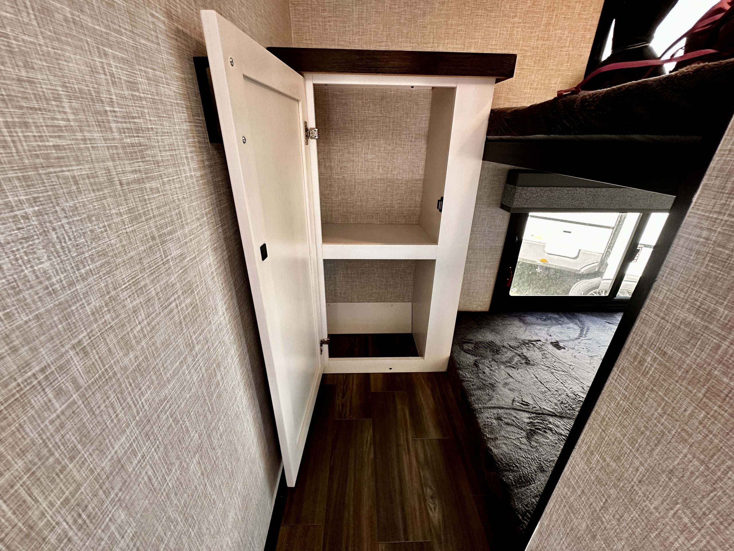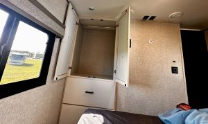 Beside the breakfast bar is a big cabinet with a removable shelf. Across from the bunks, there’s a floor to ceiling wardrobe with big drawers in the bottom for storing kid’s clothes or whatever you want. What the kitchen lacks in counter space it certainly makes up for with storage in large drawers and oversized cabinets.