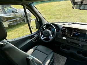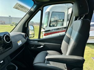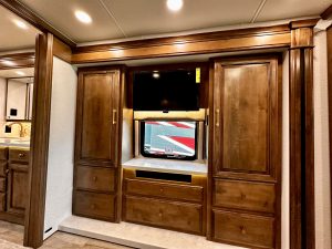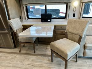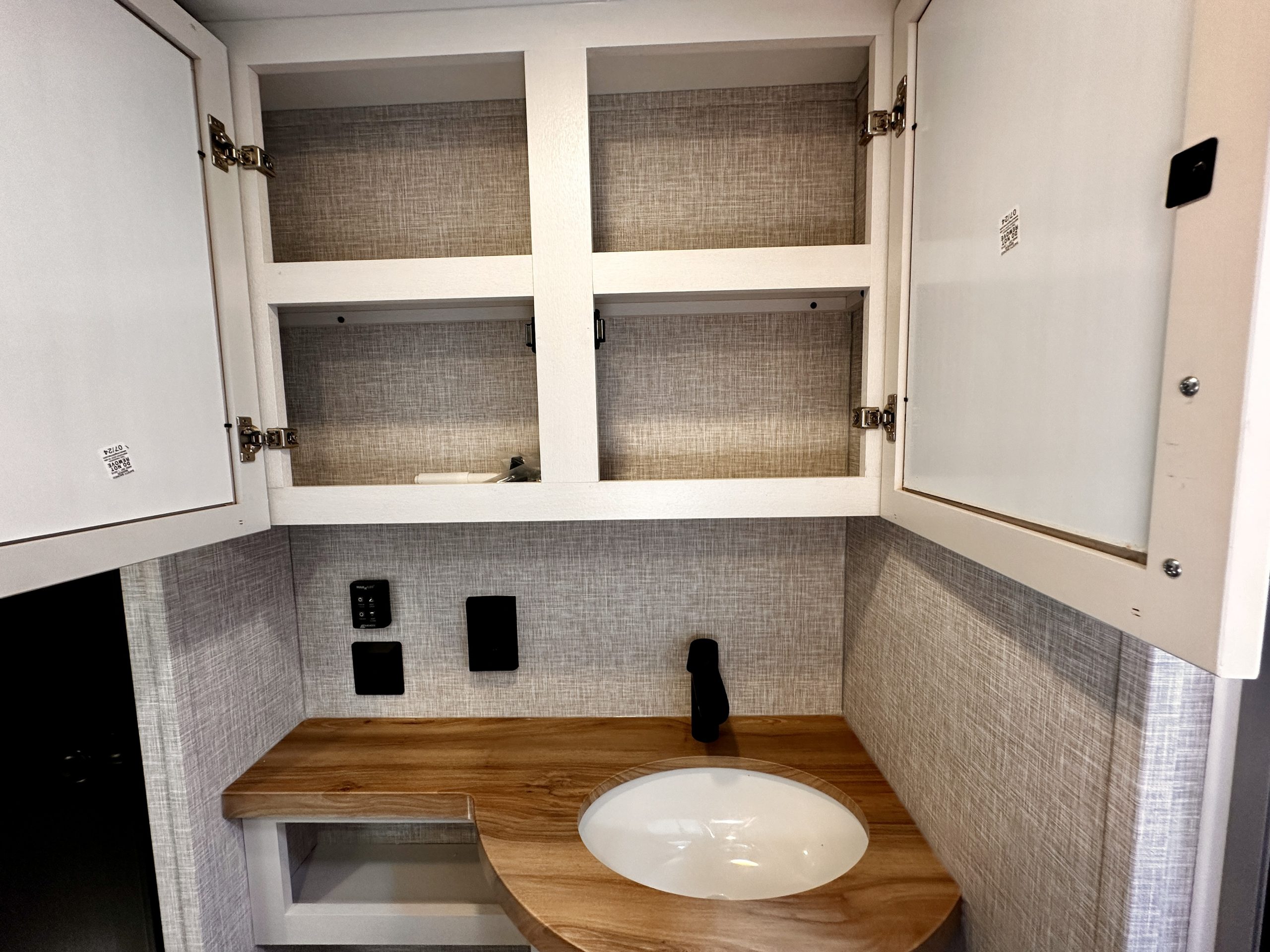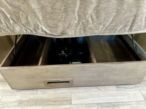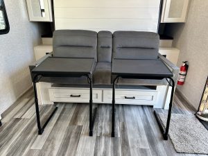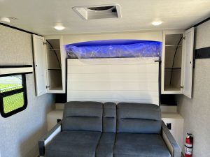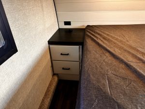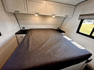 Small families will love the Jay Feather Air 18MBH floorplan. At the front of the RV, there’s a Murphy bed tucked neatly above a flip-down sofa that’s perfect for lounging in front of the TV. This is great for daytime use. (Especially when you don’t necessarily want to deploy the Murphy bed.) However, when it’s time for sleep, deploying the Murphy bed is nearly effortless. It flips down nearly instantly into a comfortable queen bed. Each side has a CPAP-machine-ready shelf with a 110-volt plugin and a USB port. Above the shelve is a mirrored wardrobe cabinet that reflects light, helping to keep the Jay Feather Air 18MBH open and airy.
