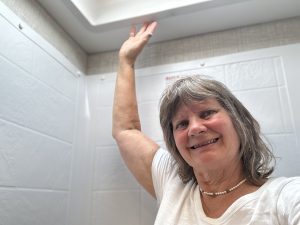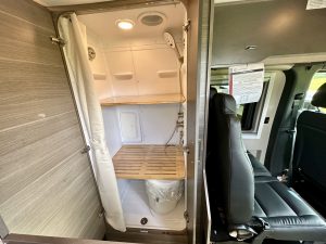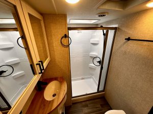 The bathroom at the back of the Jay Feather Air 18MBH is surprisingly spacious. (Especially given the 23-foot length of this small travel trailer.) Inside, you can find ample room in the vanity cabinets, the medicine cabinet and on open shelves. There’s plenty of space to store towels, toilet paper, etc. Instead of a ceramic toilet, the Jay Feather Air 18MBH gets a more weight-conscious plastic seat.
