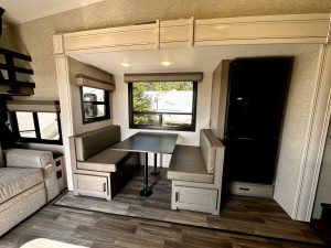 The Jay Feather Air 18MBH kitchen is functional but minimal. Between the big 12-volt refrigerator and the cabinets, there’s plenty of storage space for food, dishes, and cooking utensils here. However, there isn’t much space around the small, round sink for allowing dishes to air dry. This is where a small flip-up counter would have come in handy.