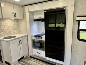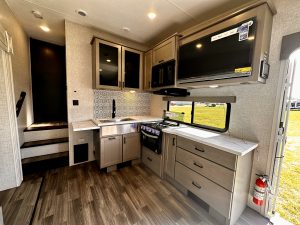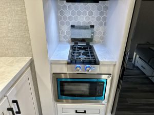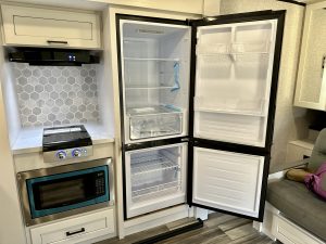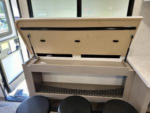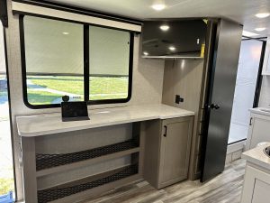 The floorplan in the Jay Feather Air 18MBH is open concept. The main living area is shared by the kitchen and the living room. Jayco’s done some innovative things here. The biggest one is that they’ve replaced the standard bench dinette with freestanding stools and a bar-height counter (a potential workstation) that overlooks a huge window. The top of this counter/workstation lifts up to reveal sizable storage space for stashing laptops and related items. Beneath this very cool counter are shelves with cargo nets to keep things from bouncing off when the trailer is in motion.