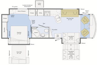 The 35P features three slideouts – including a full-wall slide on the driver’s side. This impressive floorplan features a BenchMark dinette or the optional BenchMark Dinette with extendable table and chairs, Rest Easy Sofa, open concept galley and mid-coach bath. The master bedroom has storage galore with a large wardrobe, and chest of drawers flanking the large king bed.
