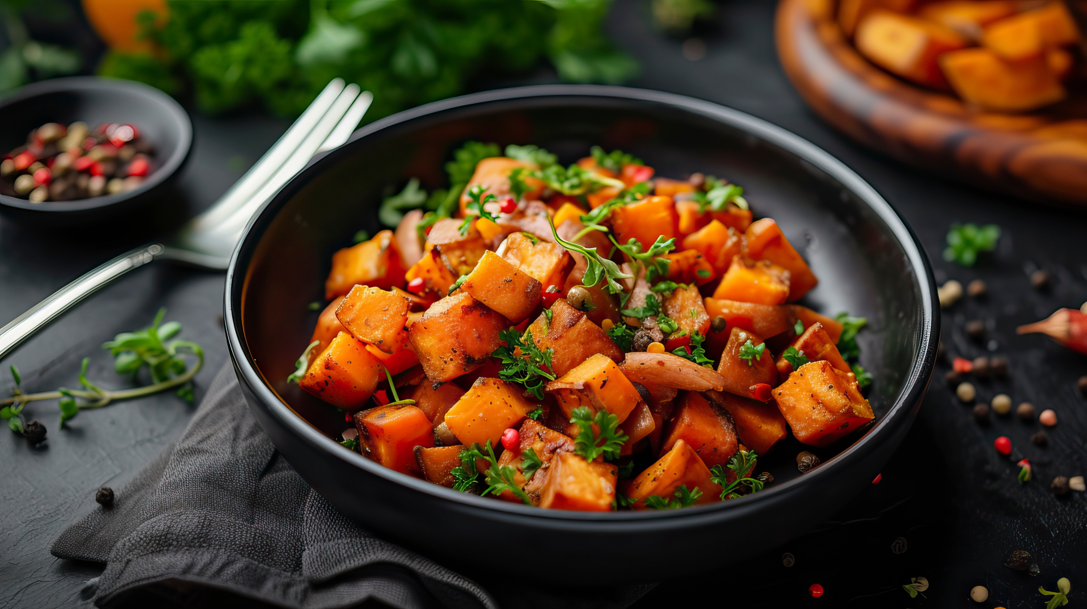 Cook the sweet potato and apple, and add a pinch of salt in the skillet and sauté until soft. Chop the bacon and add it to the skillet and sprinkle with thyme.