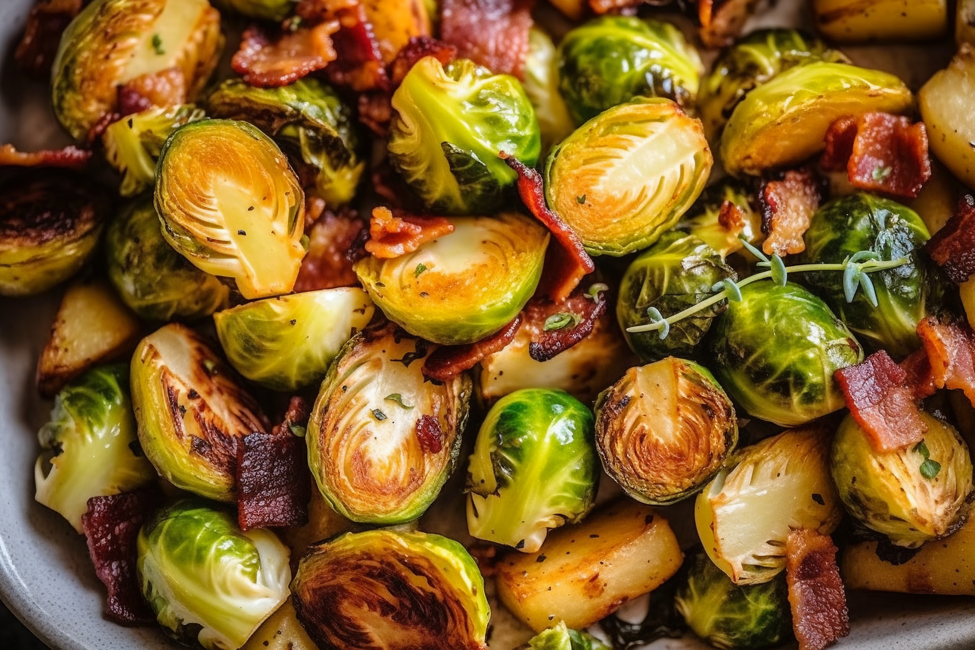 Remove from heat and add to cooked Brussel sprouts, bacon, and candied pecans.