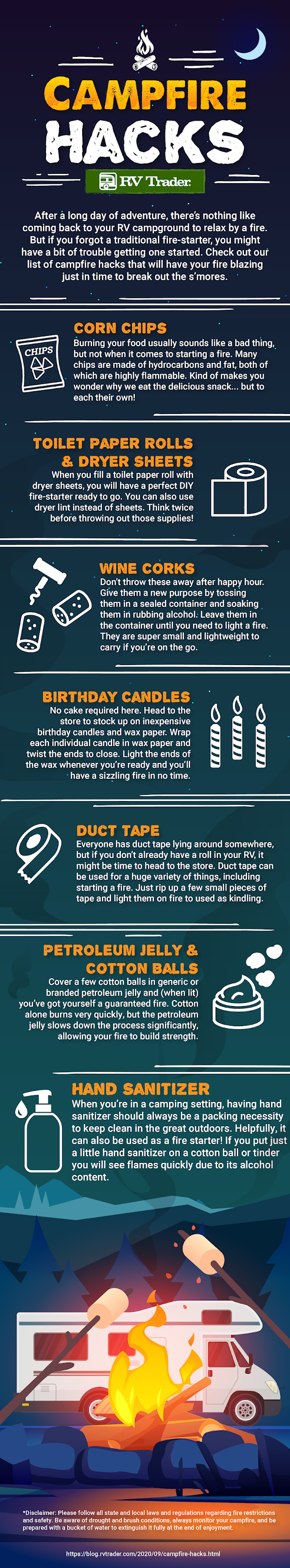 When you’re in a camping setting, having hand sanitizer should always be a packing necessity to keep clean in the great outdoors, but it can also be used as a fire starter. If you put just a little hand sanitizer on a cotton ball or tinder you will see flames quickly due to its alcohol content.