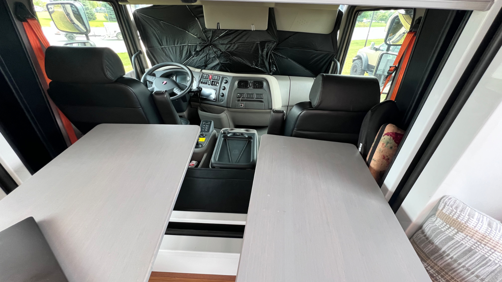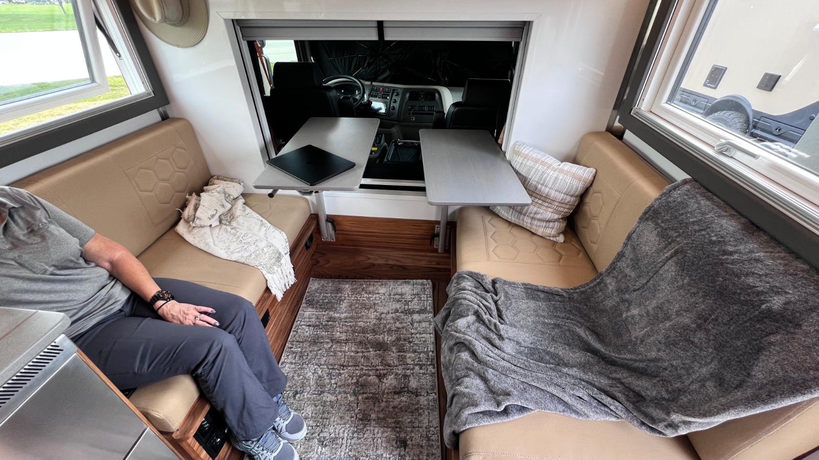Aside from the lounge area at the back of the RV — with its own Lagun style table — the Strada-ionon Lounge has four captain’s chairs at the front that swivel and adjust so everyone can sit around a Lagun table that can be quickly set up as needed. But that’s not all. The seat closest to the door can be positioned to use the flip up countertop as an additional work surface.