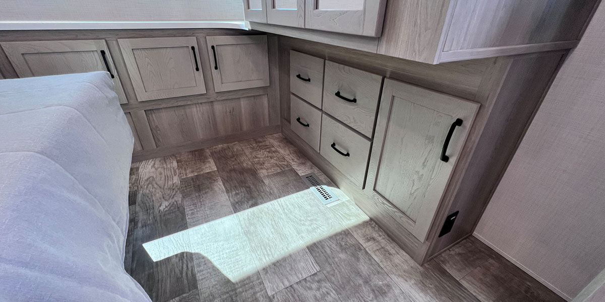 If closet and drawer space are important to you, this is a worthy contender. There are six drawers in the front bedroom along with four larger cabinets, more cabinets over the bed, and a hanging closet. The bed is lifted for additional storage and the under-bed storage is accessible through a compartment door on the outside, too.
