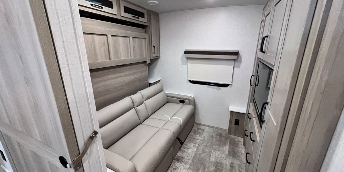 The practicality of this floor plan is also very impressive. It’s laid out so people can relax in the rear lounge area while others can work at the front. That’s especially beneficial if remote work is a part of your lifestyle — or even if you just need to catch up on email. This can all be done with the door wide open because Grech RV provides a screen door to protect you from any insects that might like to wander in.