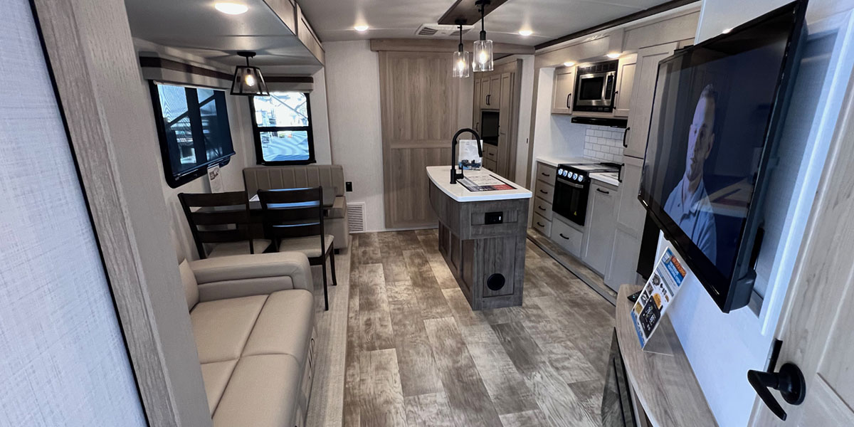 First up, we have the Keystone Sprinter. This travel trailer is a popular choice for shoppers who search our marketplace because it provides a homelike camping experience. The Keystone Sprinter has the ideal layout for traveling families, from its cozy front kitchen to the spacious living area. The storage and towing stability of this model helps to make outdoor living easier than ever. Make sure to read online Keystone Sprinter reviews to learn about other RVers’ experience with this model.