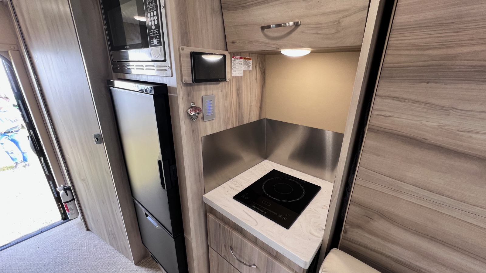 The kitchen area of the Strada-ion Lounge has a lot of features that we’ve become accustomed to finding in larger RVs. There’s a lot to love in this functional kitchen. Here’s what I mean: