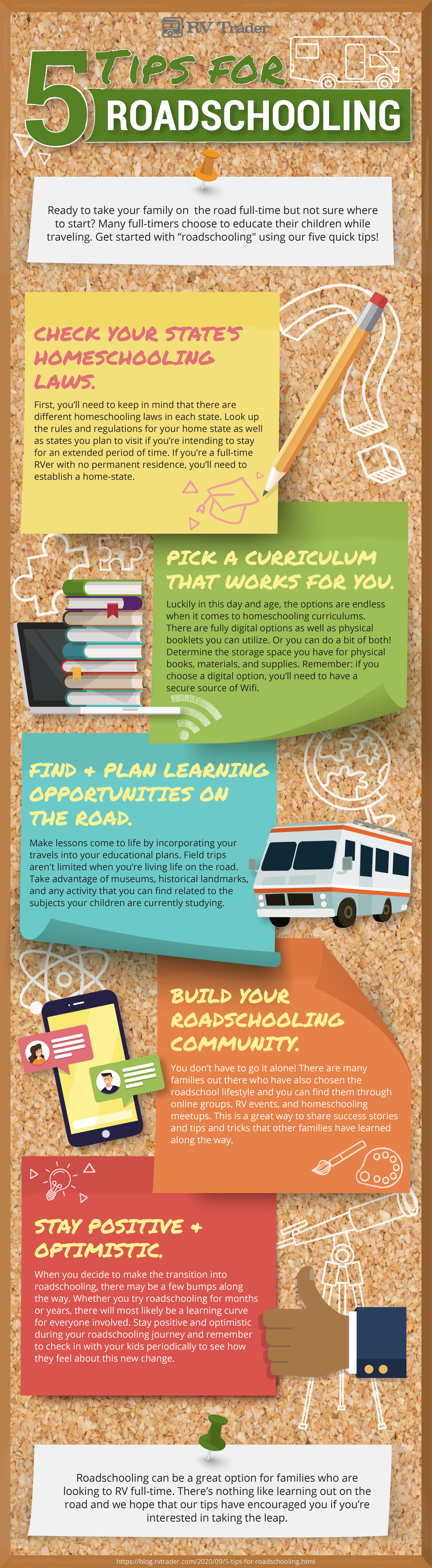 First, you’ll need to keep in mind that there are different homeschooling laws in each state. Look up the rules and regulations for your home state, as well as states you plan to visit if you’re intending to stay for an extended period of time. If you’re a full-time RVer with no permanent residence, you’ll need to establish a home state.